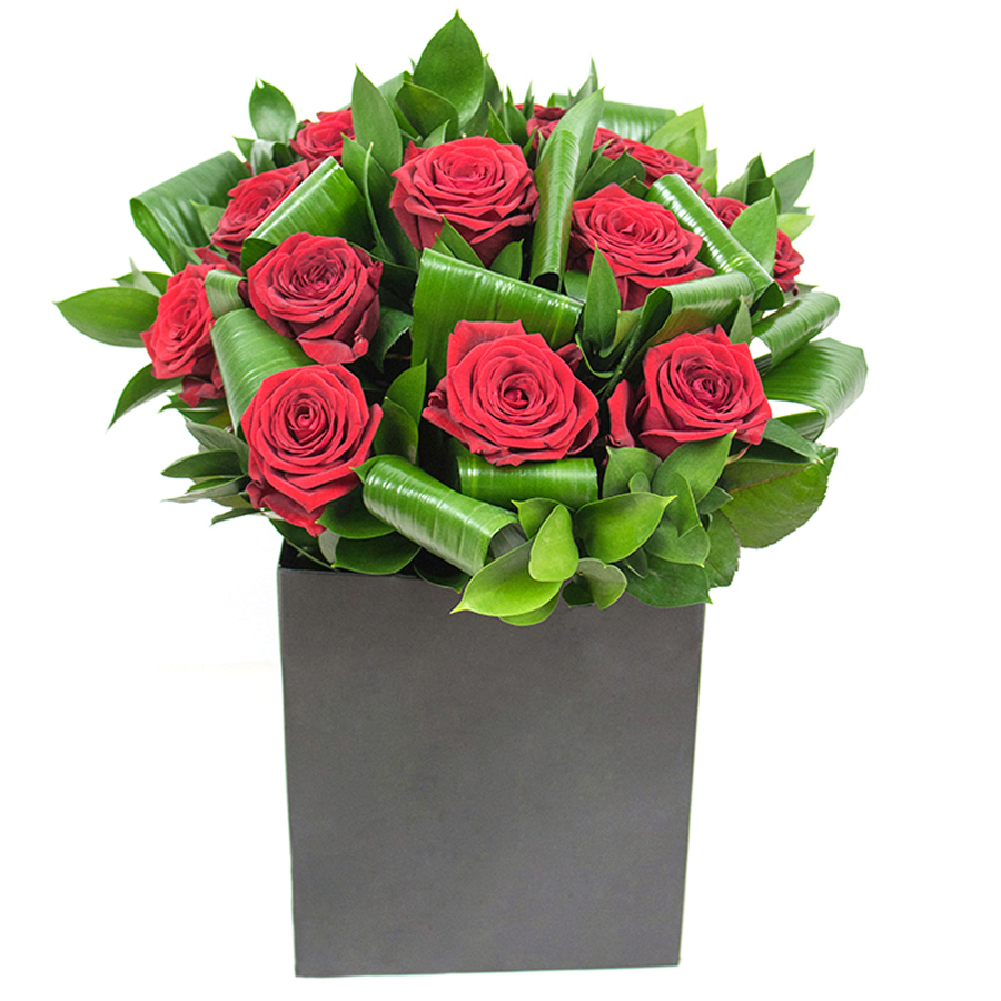 Our stunning bouquet features vibrant red roses complemented by lush aspidistra leaves and delicate ruscus, creating a unique and stylish display that enhances any home or office.